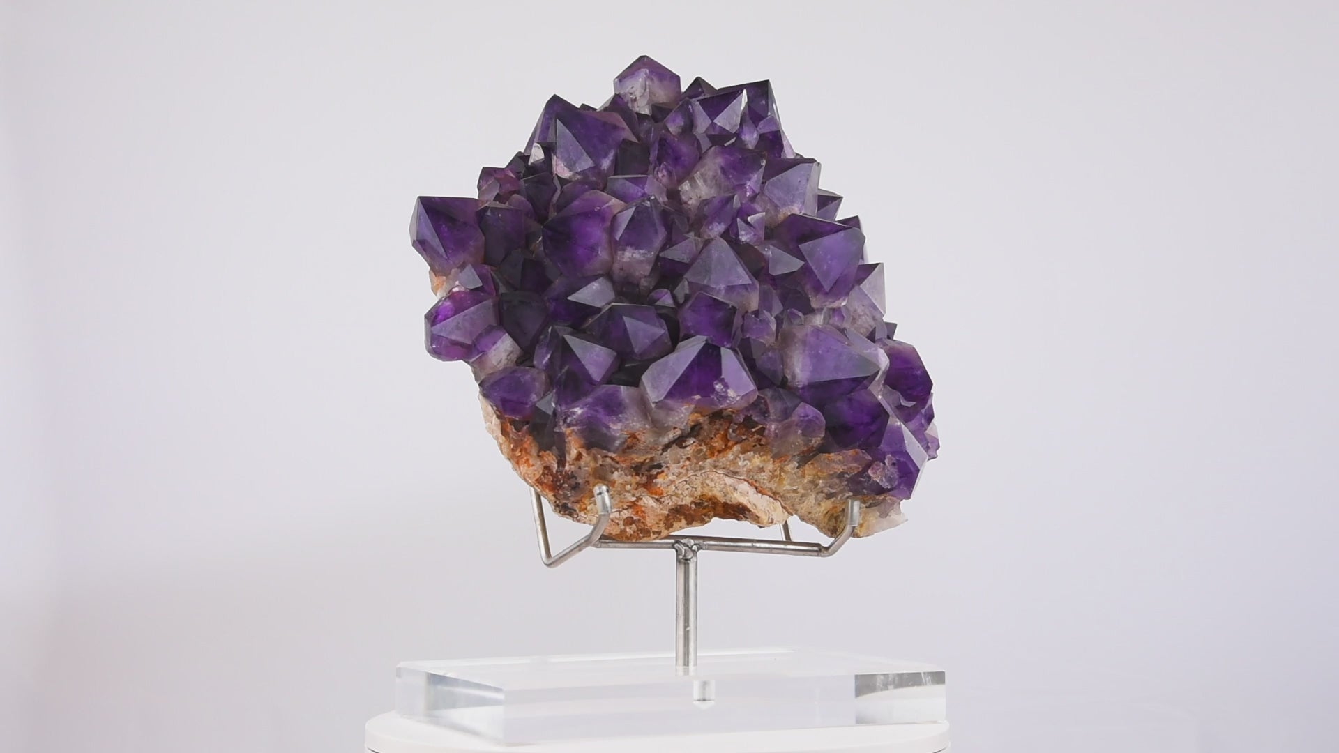Amethyst cluster with striking natural geometry and rich violet tones. A statement object that elevates interiors, pairing effortlessly with marble, brass, or wood accents.