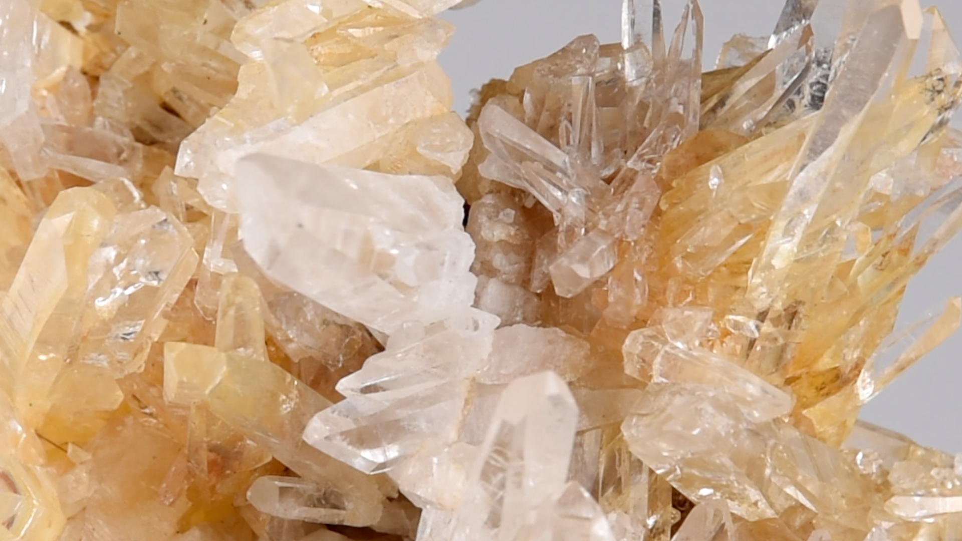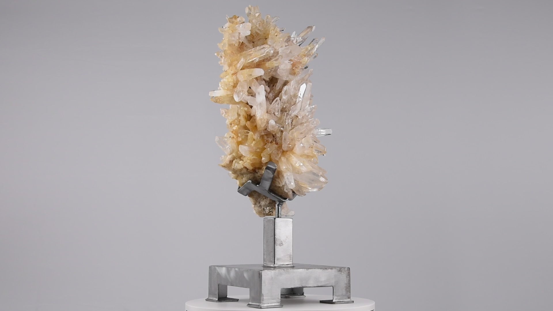 A striking Colombian quartz cluster, elevated on a hand-crafted metal stand. Its dramatic crystal sprays and warm golden tones make it a commanding statement piece.