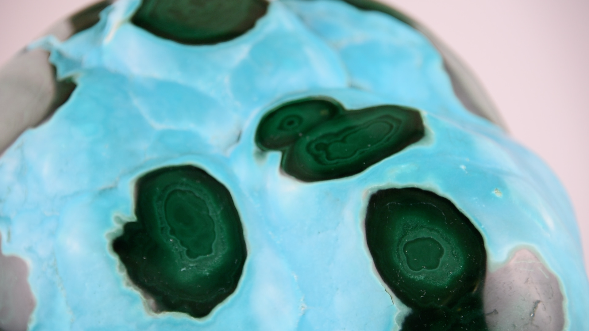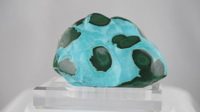 A striking interplay of vivid turquoise blue and deep green banding, this polished freeform reveals the rare fusion of malachite and chrysocolla. Its sculptural presence brings bold color and natural artistry to consoles, bookshelves, or desktops.