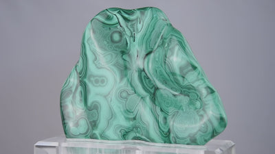 A striking malachite freeform showcasing bands of emerald and jade green, polished to reveal its natural depth and luminosity. Set on a clear acrylic base, this one-of-a-kind specimen balances organic beauty with sculptural refinement, making it a versatile centerpiece for elevated interiors.