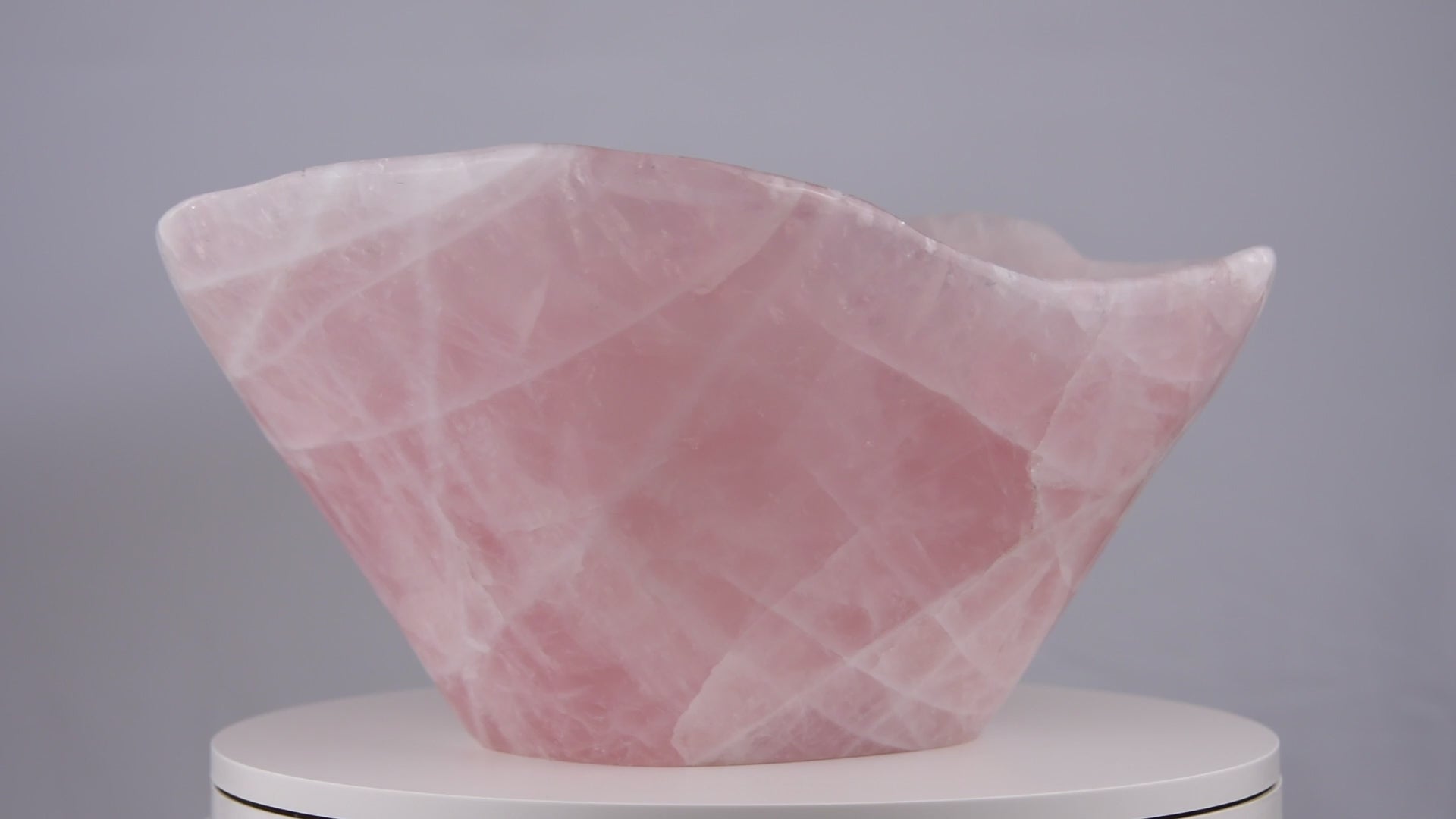 A commanding piece of rose quartz, this hand-carved bowl makes a striking centerpiece. Ideal for entry consoles, dining tables, or as a sculptural focal point in spacious interiors.