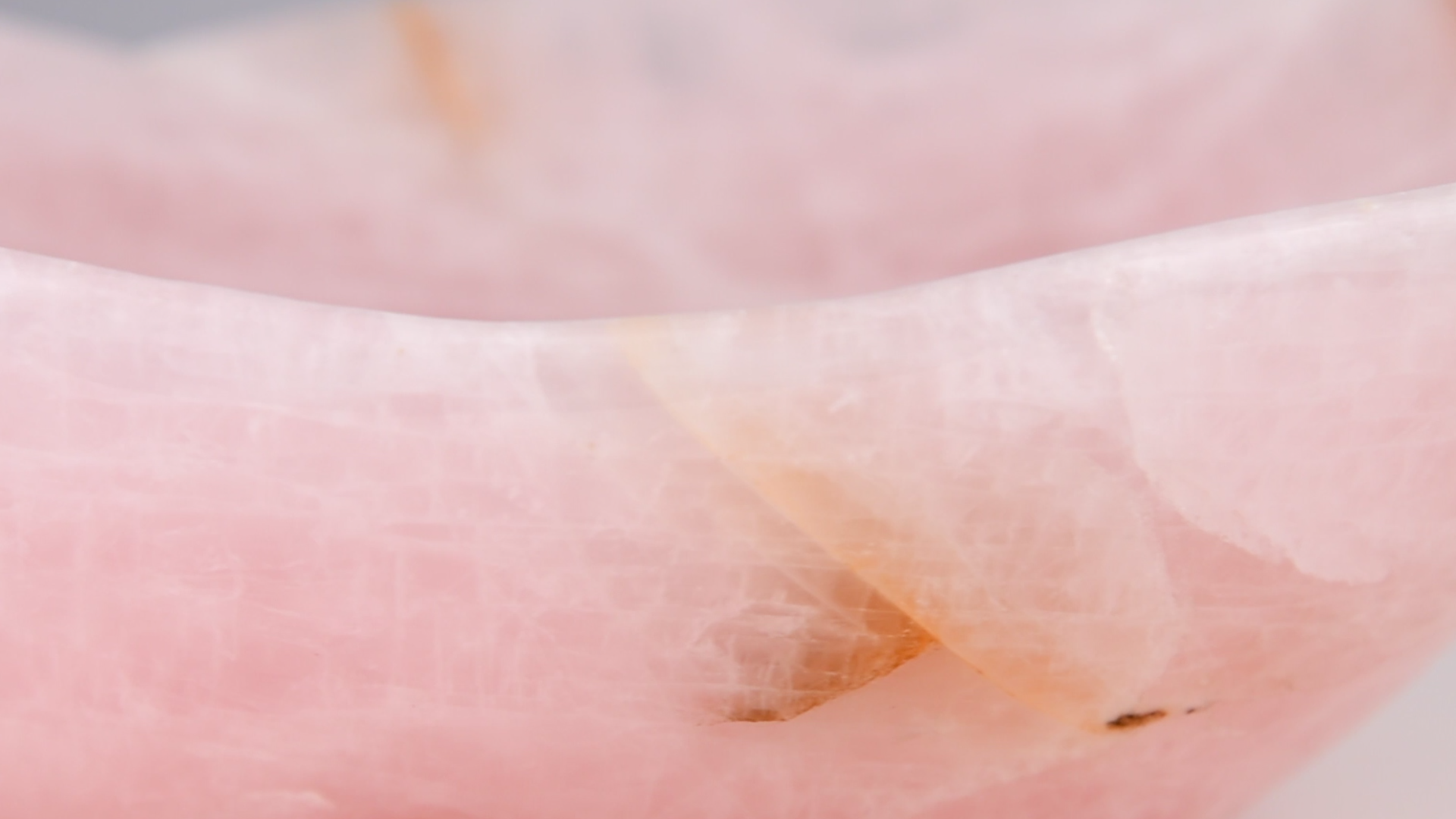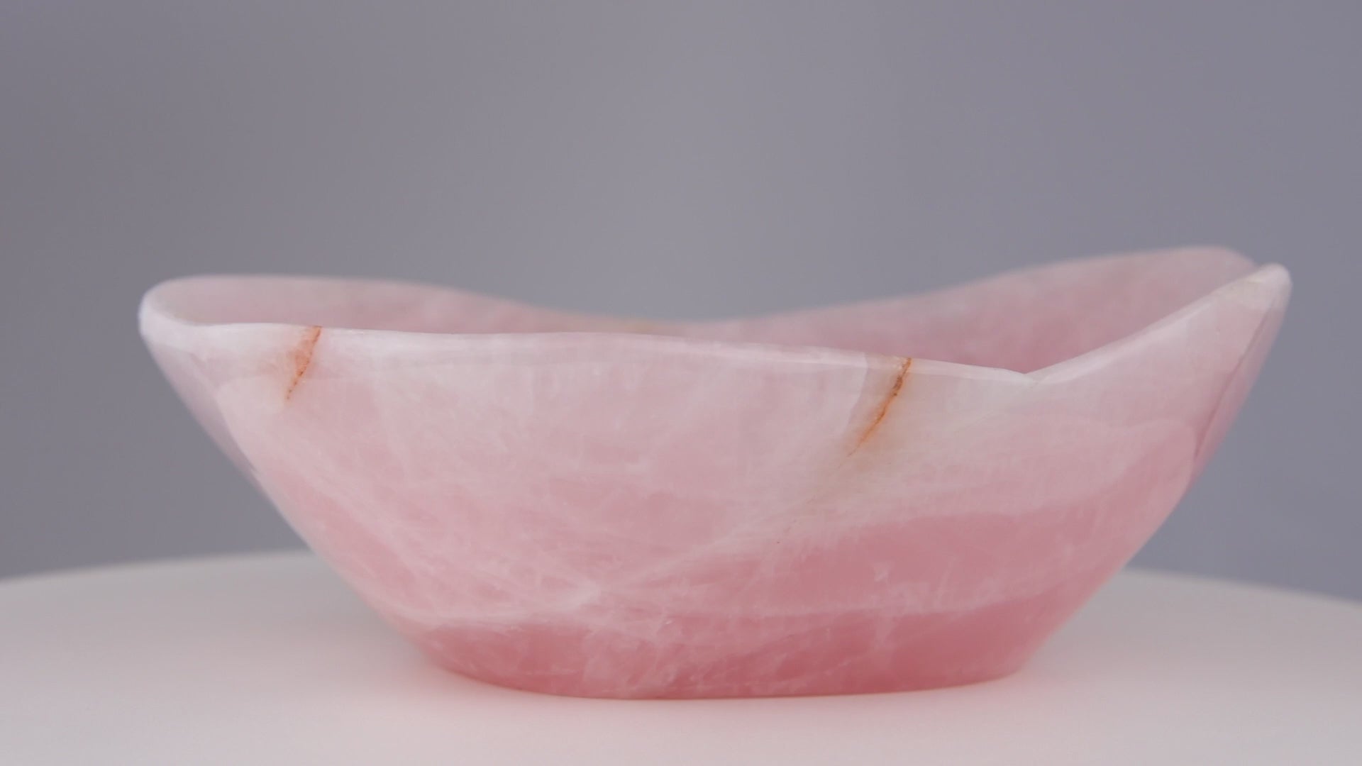 A medium-sized hand-carved rose quartz bowl, polished to reveal glowing translucence and natural veining. At once functional and sculptural, it embodies timeless elegance and refined craftsmanship.