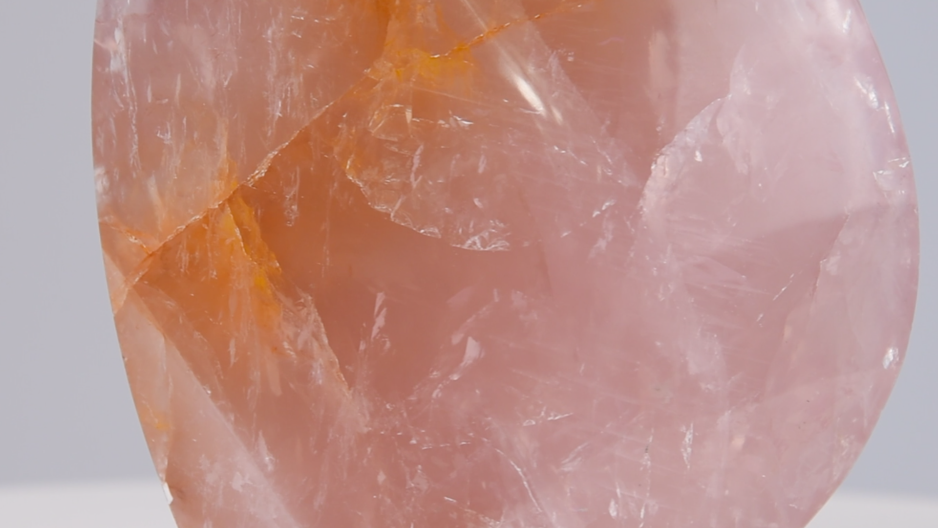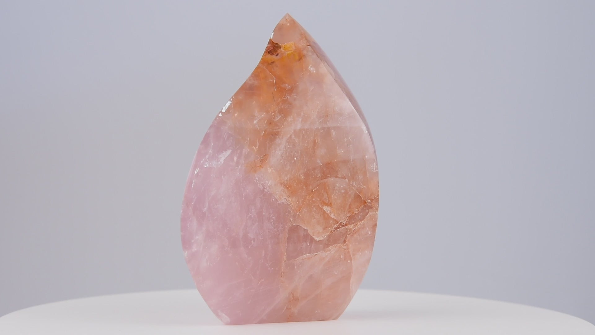 Hand-carved Brazilian rose quartz sculpture with warm golden inclusions and luminous translucence. A refined collectible piece that balances elegance and natural artistry.