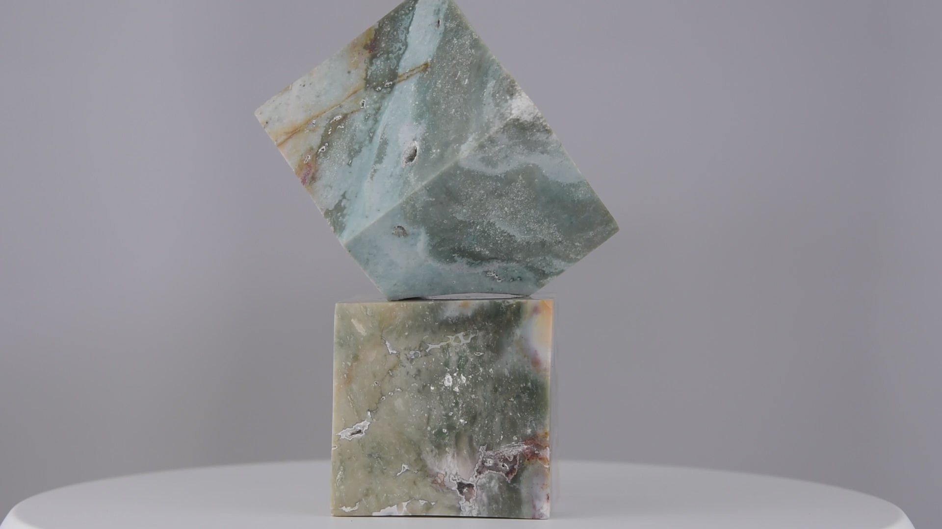 Shades of sage green, mist grey, and soft stone ripple across these hand-carved marble cubes. Their serene palette and architectural form bring sculptural calm and quiet sophistication to any space.