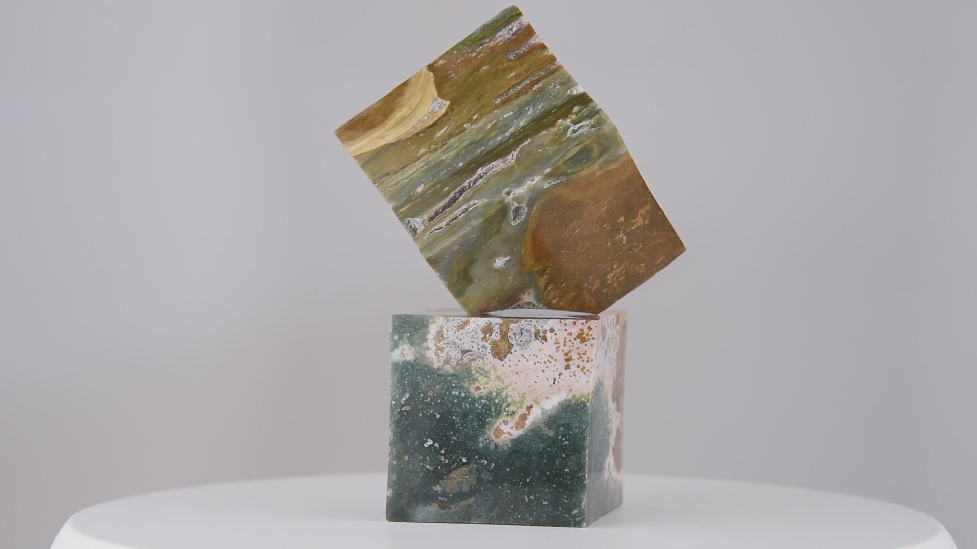Bands of ochre, moss green, and stone grey ripple across this marble cube set, evoking the textures of earth and shifting landscapes. The pair’s layered palette and polished form create a grounded yet sophisticated presence, making them versatile accents for both modern and traditional interiors.